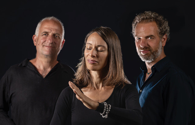 Begleitet vom Gitarristen und Klangkünstler der auf seiner Gitarre spielt als gäbe es keine Grenzen auf dieser Welt und dem Percussionisten, der mit seinen Händen die feinsten Rhythmen aus seinen Instrumenten entlockt.