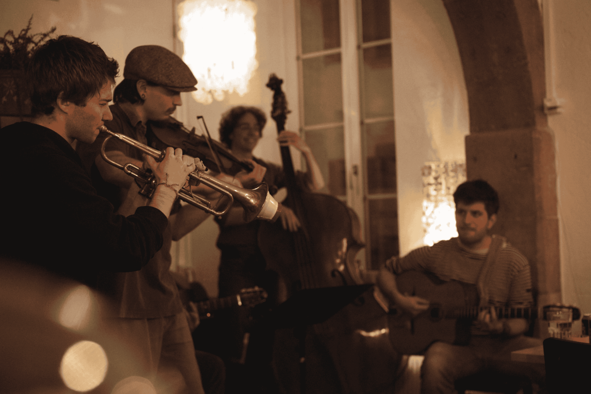 Der Sound des Gustavo Swingtet verwandelt schicke Restaurants in kratzige Bars und verbreitet Lagerfeuerstimmung an Strassenecken. Mit vorwärts treibenden Rhythmusgitarren, tanzenden Kontrabasslinien und dem feurigen Zusammenspiel von Geige und Trompete verkündet die Band ihre Liebe zur Musik von Django Reinhardt und dem Jazz Manouche, die auch in Ihren eigenen Stücken immer wieder durchschimmert. Die Bandmitglieder durchlaufen dabei eine Mischung aus Tanzen, Grinsen, Klatschen, Weinen, Brüllen und stillem Träumen und manchmal, immer wieder mal, da brennt ein Solo mit ihnen durch.