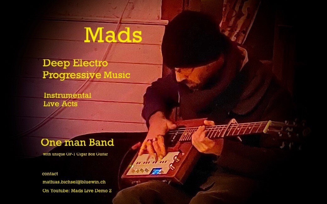 Mathias Bichsel aka Mads est un musicien autodidacte qui a cherché à créer sa propre musique en utlilisant des loopers et divers instruments électroniques. Après des années de pratique, il a finalement développer son propre instrument en intégrant un OP-1 (sequenceur) dans une cigar box guitar. Cet instrument unique lui permet de jouer en live comme One Man Band et propose des sets d’electro progressive.
