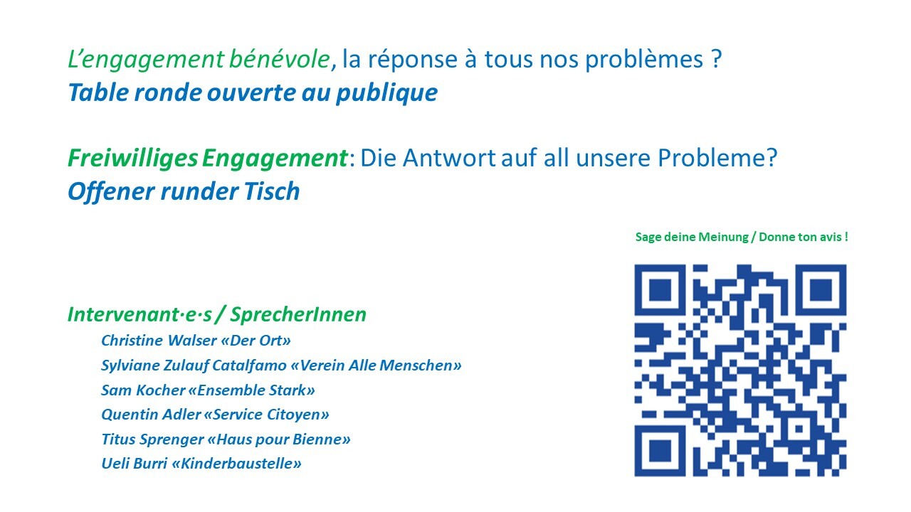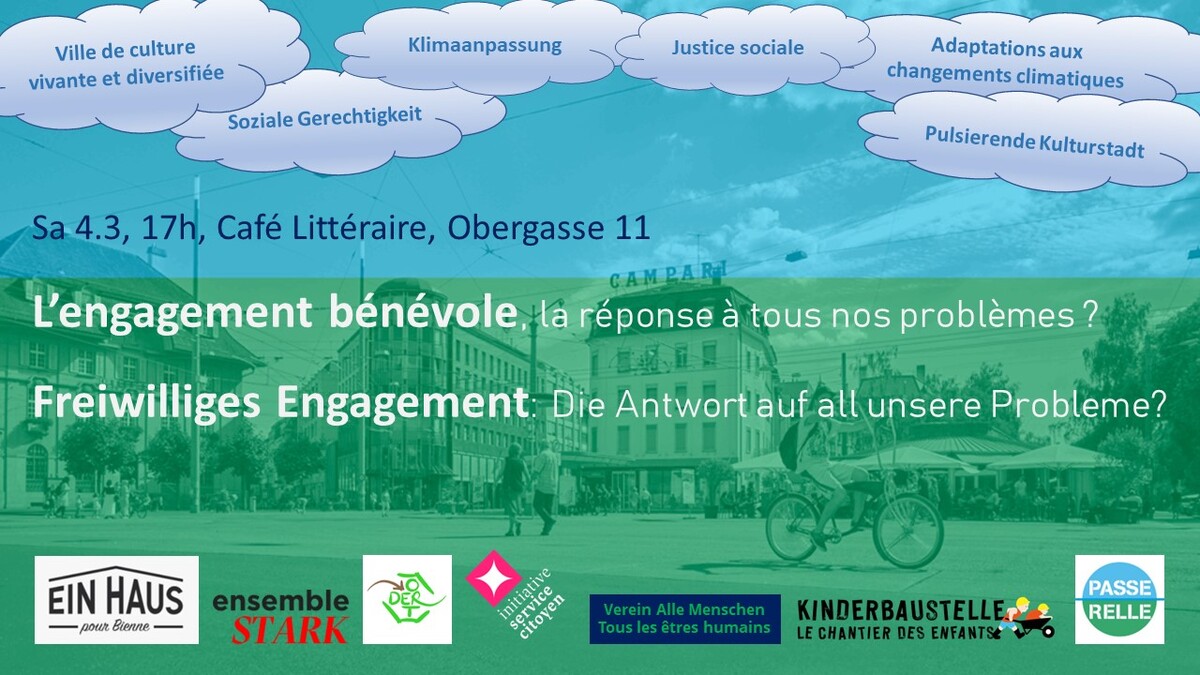 La Passerelle vous invite au Café Littéraire pour une soirée de débat sur l'engagement bénévole ! Seront présents Christine Walser « Der Ort », Sylviane Zulauf Catalfamo « Verein Alle Menschen », Sam Kocher « ensembleSTARK », Quentin Adler «Initiavie Service Citoyen», Titus Sprenger « Haus pour Bienne », Ueli Burri « Kinderbaustelle ». Modération: Alain Bopp.